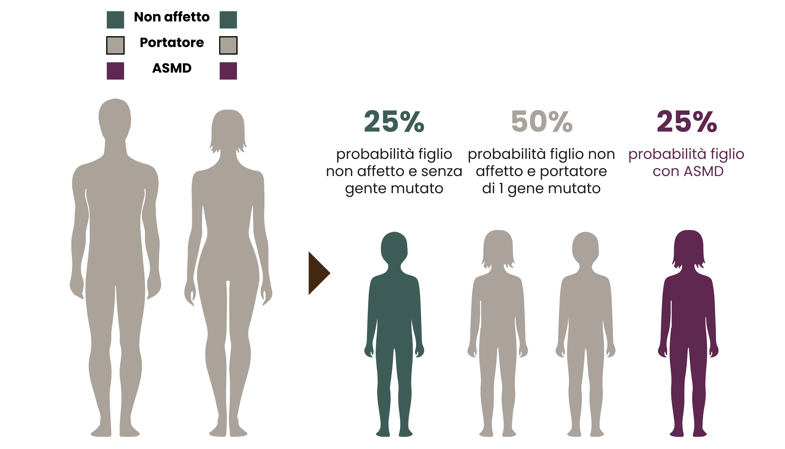 - 25% di probabilità di avere un figlio con ASMD, perché ha ereditato il gene SMPD1 mutato da entrambi i genitori,